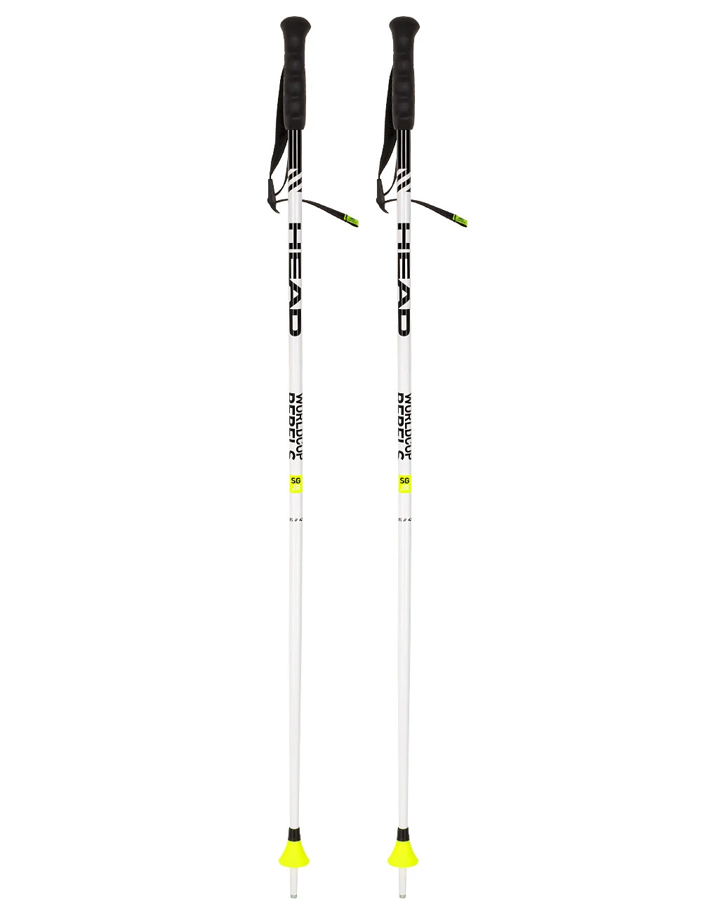 Head Worldcup SG Jr to juniorskie zawodnicze kije narciarskie o średnicy 16 mm, charakteryzujące się niską wagą oraz dużą elastycznością jak na kija narciarskiego zapobiegającą łamaniu kija.
