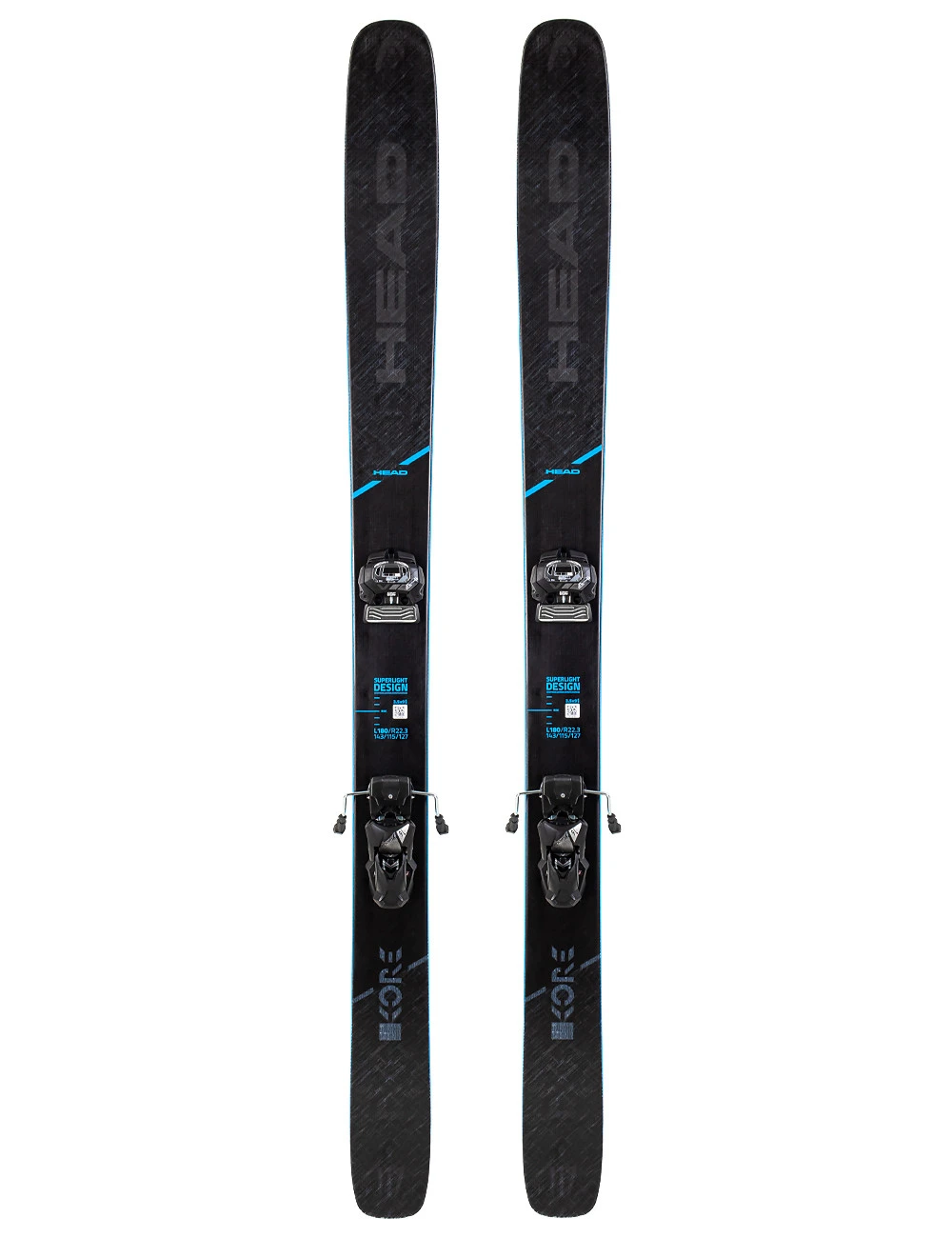 Narty Head KORE zestawiono z wiązaniami narciarskimi HEAD ATTACK 16, które montowane są bezpośrednio na narcie bez użycia płyty. Montaż wiązań dokonujemy na podstawie podanej długości skorupy buta [mm]. Po wkręceniu wiązań do narty, tylni bezpiecznik jest dodatkowo ruchomy i posiada możliwość dodatkowej regulacji (zakres 3 cm) w przypadku zmiany rozmiaru buta.