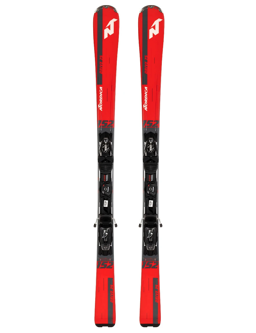 Narty Nordica DRIVE zestawiono z wiązaniami Nordica ADV 10 EVO z zakresem wartości skali DIN 3 – 10. Wiązania montowane są na płycie szynowej ADV EVO z manualną regulacją rozstawu wiązań.