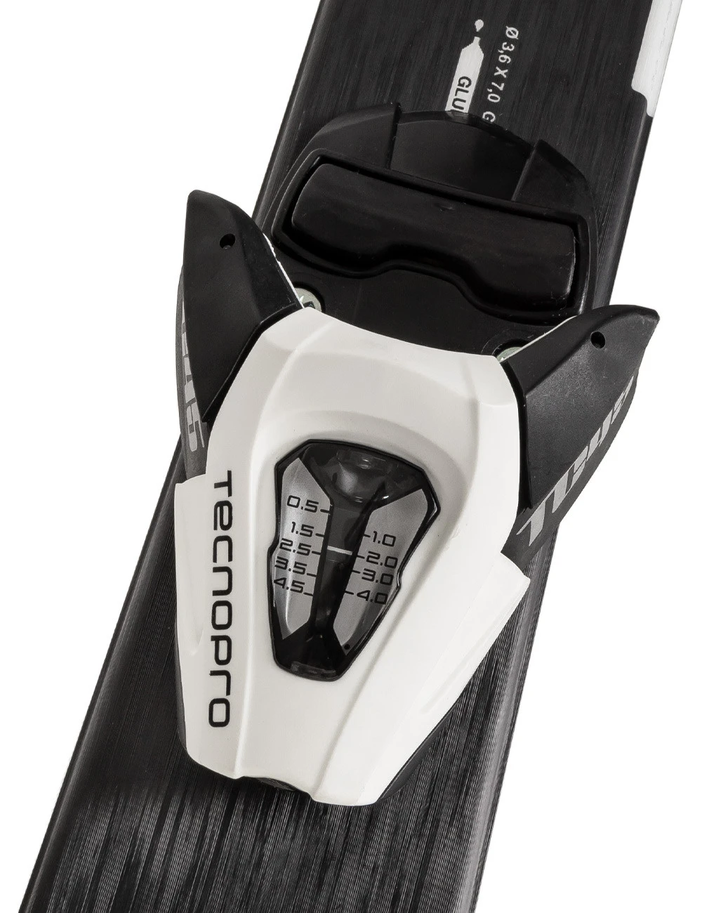 Narty TecnoPro zestawiono z wiązaniami narciarskimi Tecno NTC 45 , montowanymi bezpośrednio na narcie bez dodatkowej płyty pod wiązaniem.