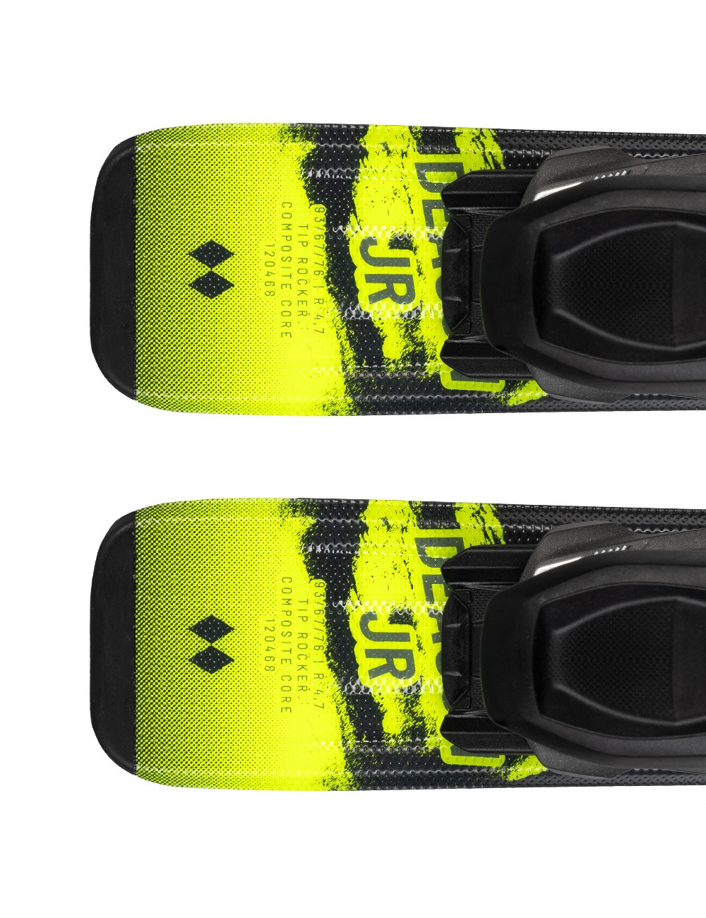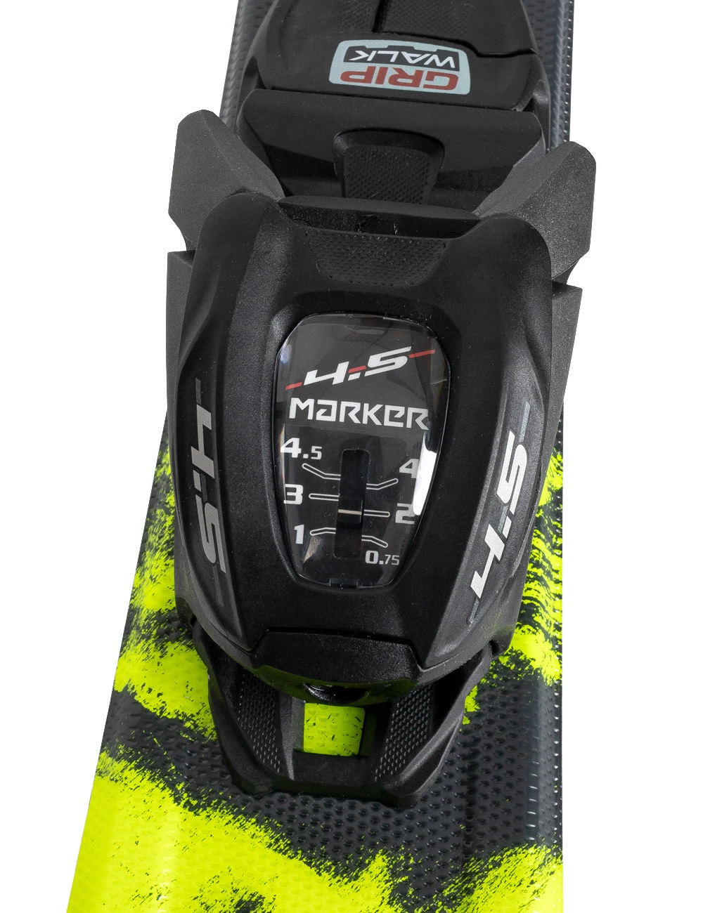 Narty Volkl Deacon Jr zestawiono z wiązaniami narciarskimi Marker 4.5, które montowane są na dodatkowej płycie szynowej pod wiązaniem. System montażu umożliwia regulację beznarzędziową rozstawu bezpieczników do długości skorupy butów narciarskich w zakresie 190 – 285 mm.