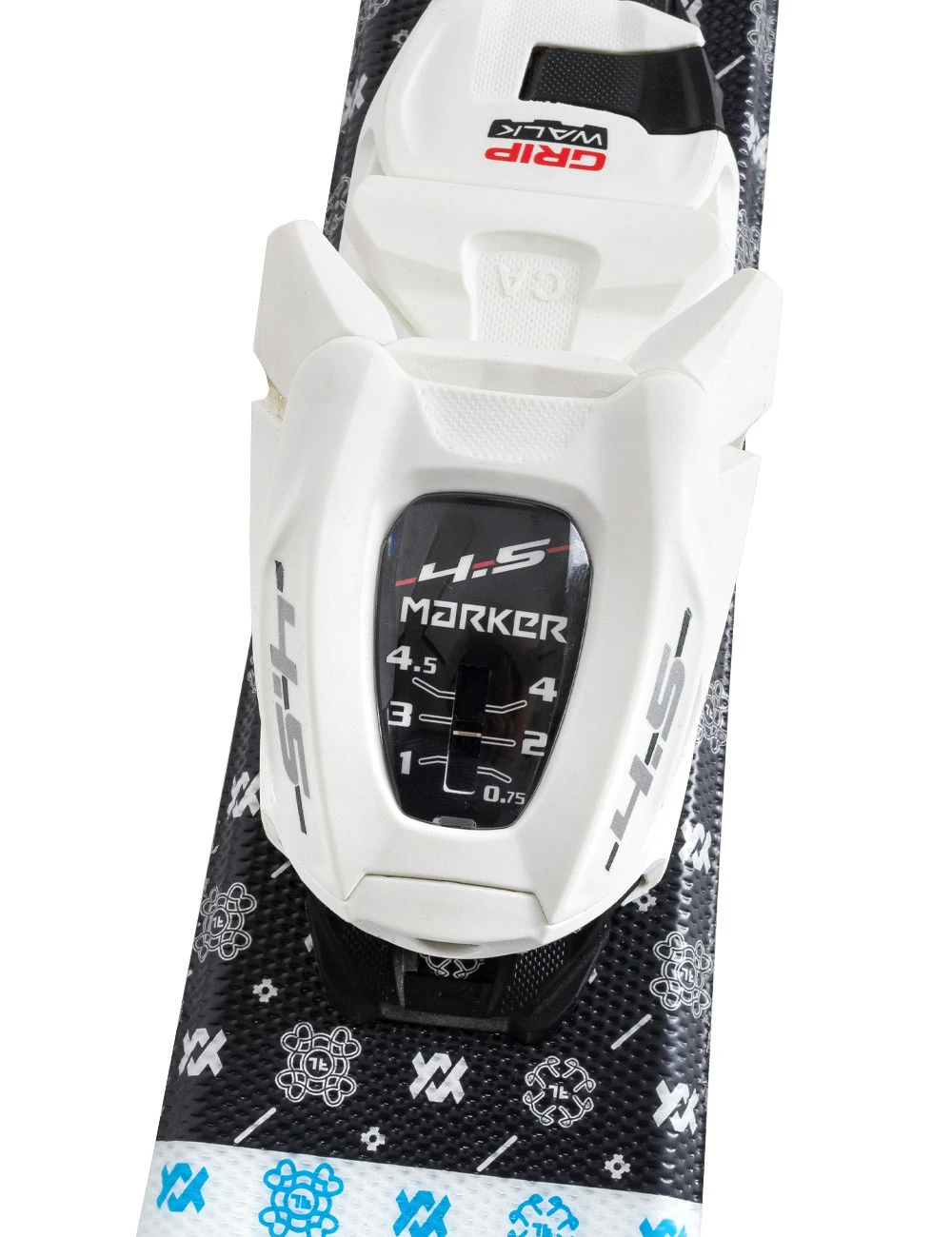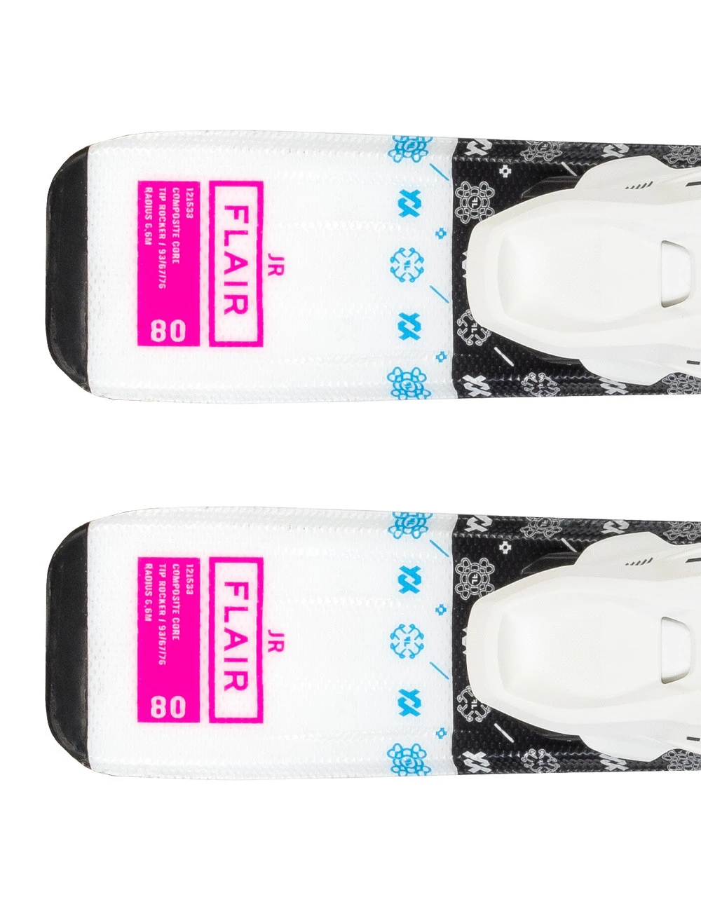 Narty Volkl Flair zestawiono z wiązaniami narciarskimi Marker 4.5, które montowane są na dodatkowej płycie szynowej pod wiązaniem. System montażu umożliwia regulację beznarzędziową rozstawu bezpieczników do długości skorupy butów narciarskich w zakresie 190 – 285 mm.