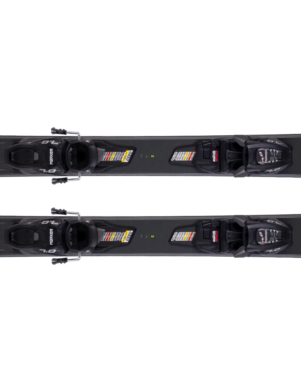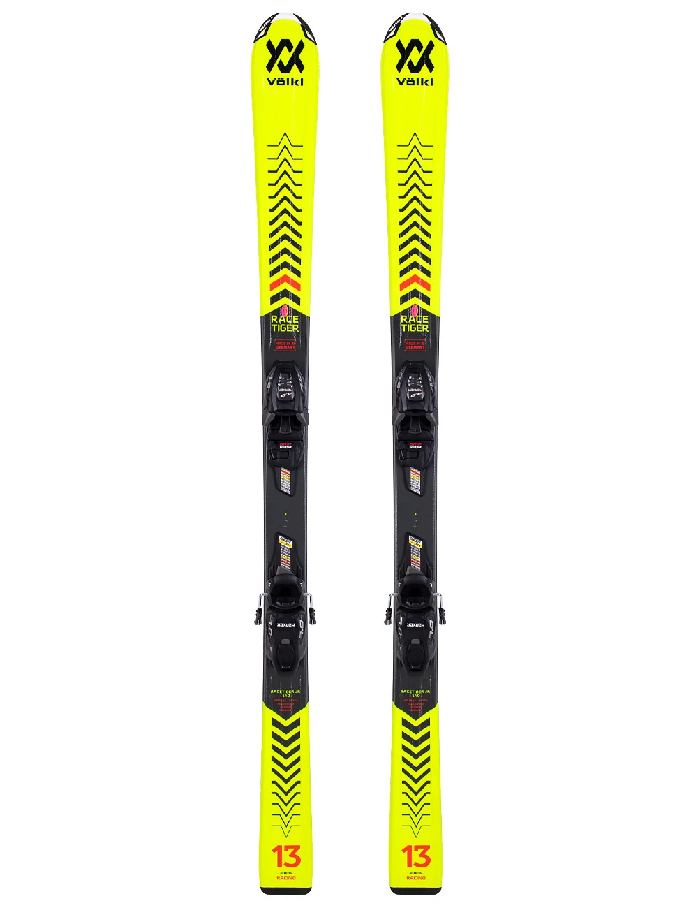 Narty Volkl Racetiger Jr zestawiono z wiązaniami narciarskimi Marker Vmotion 7.0, które montowane są na dodatkowej płycie pod wiązaniem. Skala siły wypięcia DIN wiązań wynosi 2 – 7.