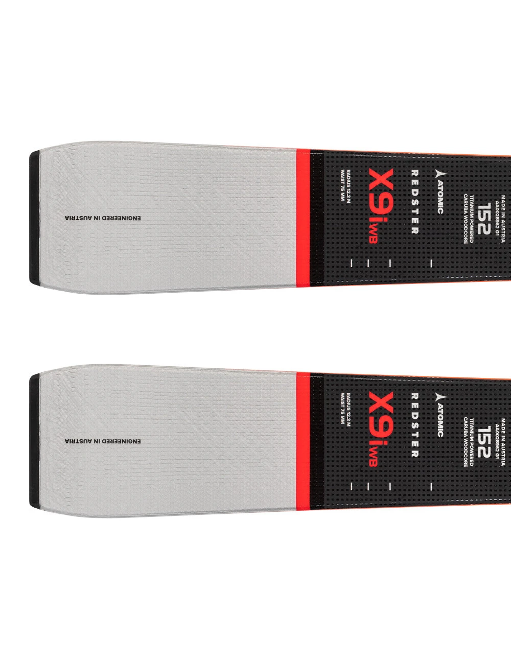 Narty Atomic Redster X9 zestawiono z wiązaniami Atomic X12 z maksymalnym rozstawem wiązań w zakresie długości skorupy buta 265-360 mm oraz zakresem wartości siły wypięcia DIN 4-12 .