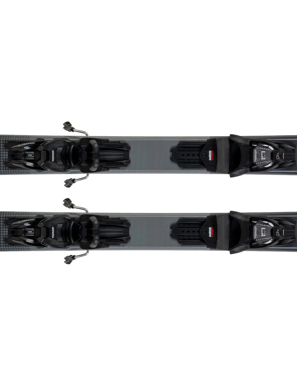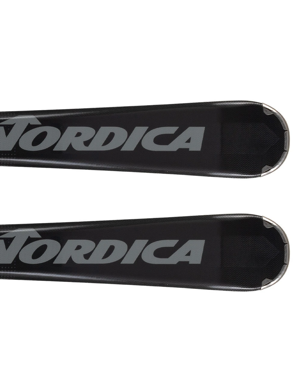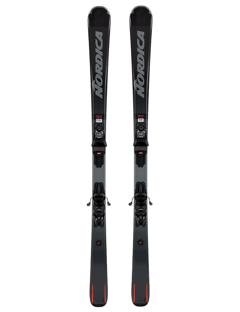 Narty Nordica DRIVE zestawiono z wiązaniami Marker TLT z zakresem wartości skali DIN 3 – 10. Wiązania montowane są na płycie szynowej z manualną regulacją rozstawu wiązań.