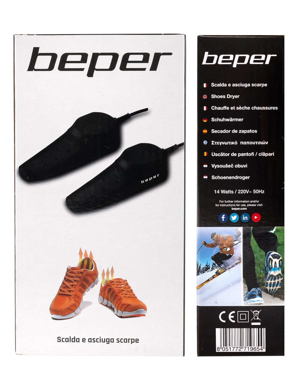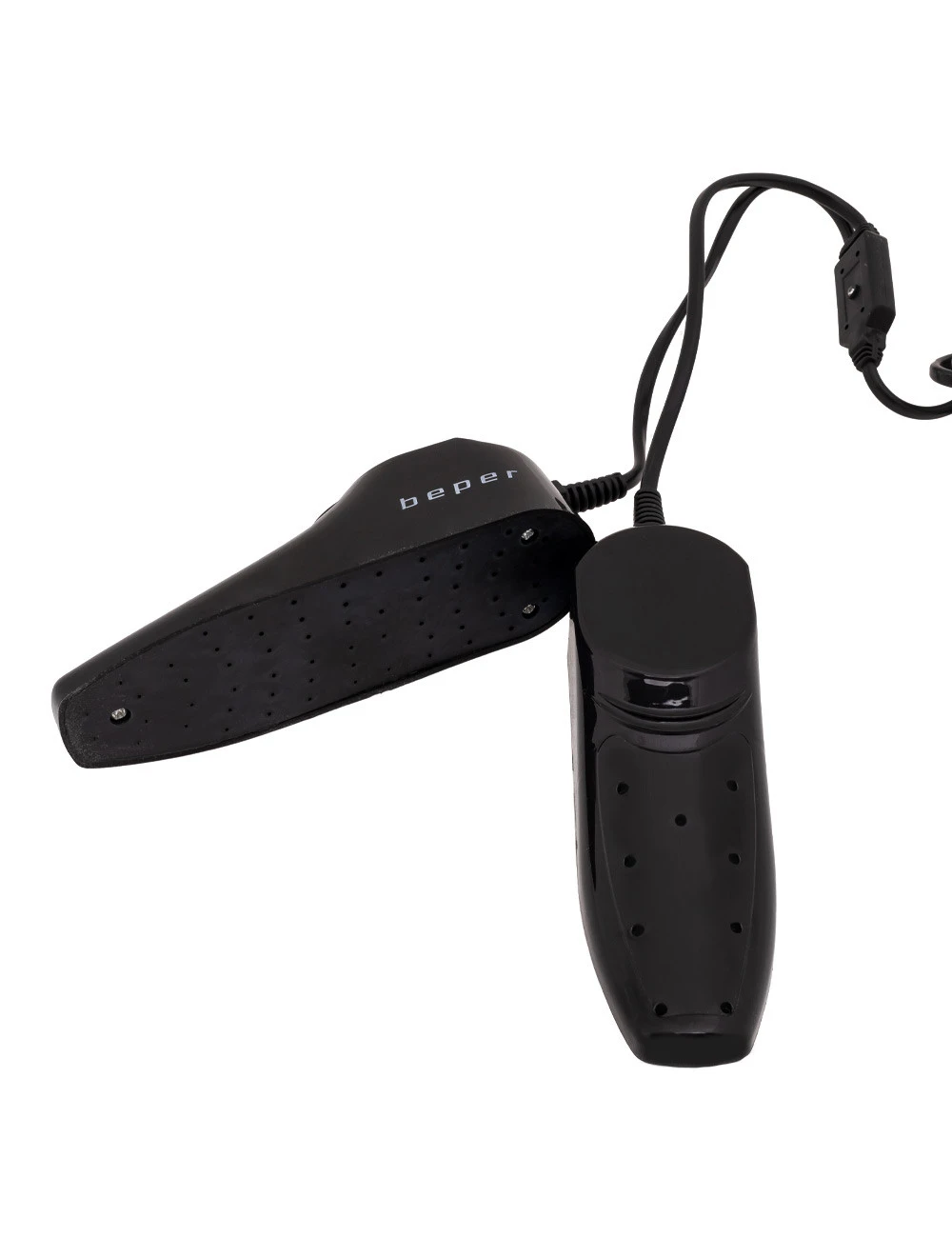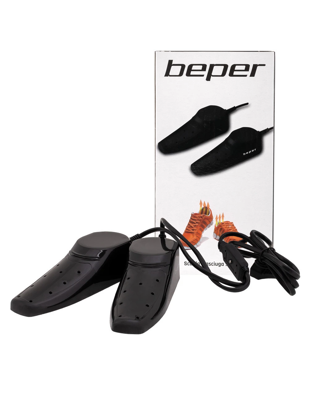 Elektryczna suszarka marki Beper przeznaczona jest do suszenia wszelkiego rodzaju obuwia, rękawic itp. Dzięki suszarce w stosunkowo krótkim czasie wysuszysz swoje mokre lub zawilgocone buty. Suszarka składa się z dwóch końcówek z grzałkami połączonych jednym przewodem z wtyczką. Suszarka Beper jest prosta i łatwa w obsłudze – wystarczy umieścić grzałki w butach i wpiąć wtyczkę do gniazdka, a suszarka zacznie się nagrzewać (max. do 80°C). Mały rozmiar i niska waga pozwalają zabrać ją ze sobą praktycznie wszędzie. Suszarka Beper jest bezpieczna dla każdego rodzaju materiałów.